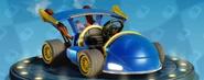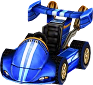 L'équipe pilote des karts bleus. L'avant est arrondi et est décoré de deux rayures blanches verticales. Une bordure dorée sépare l'avant du châssis. Entre les roues se trouvent une autre carrosserie bleue.