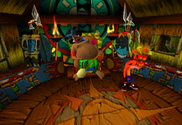 Crash entre dans la hutte de Papu Papu pendant sa sieste. Ce dernier utilise son bâton autour de la pièce et tente de le frapper au sol avec. Crash doit lui sauter dessus assez souvent.