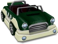 Le kart a l'apparence d'une petite voiture verte foncée rectangulaire. Ses profils sont décorés d'un quadrillage blanc, qui est aussi la couleur du châssis.